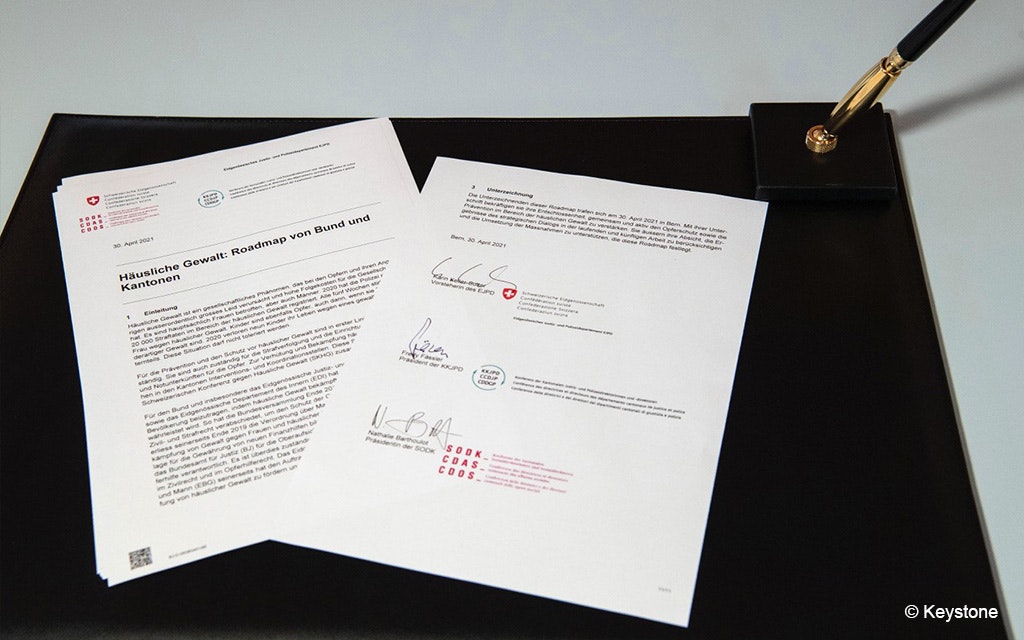 Bund, Kantone und Organisationen der Zivilgesellschaft bündeln ihre Kräfte zur Verhütung und Bekämpfung von häuslicher Gewalt. Am Strategischen Dialog "Häusliche Gewalt" vom 30. April 2021 in Bern haben sich auf Einladung des Eidgenössischen Justiz- und Polizeidepartements alle relevanten Akteure im Kampf gegen häusliche Gewalt an einen Tisch gesetzt. Zum Abschluss des Anlasses haben Bund und Kantone eine Roadmap unterzeichnet. Diese enthält konkrete Massnahmen, darunter den Einsatz technischer Mittel oder eine zentrale Telefonnummer für Opfer häuslicher Gewalt.