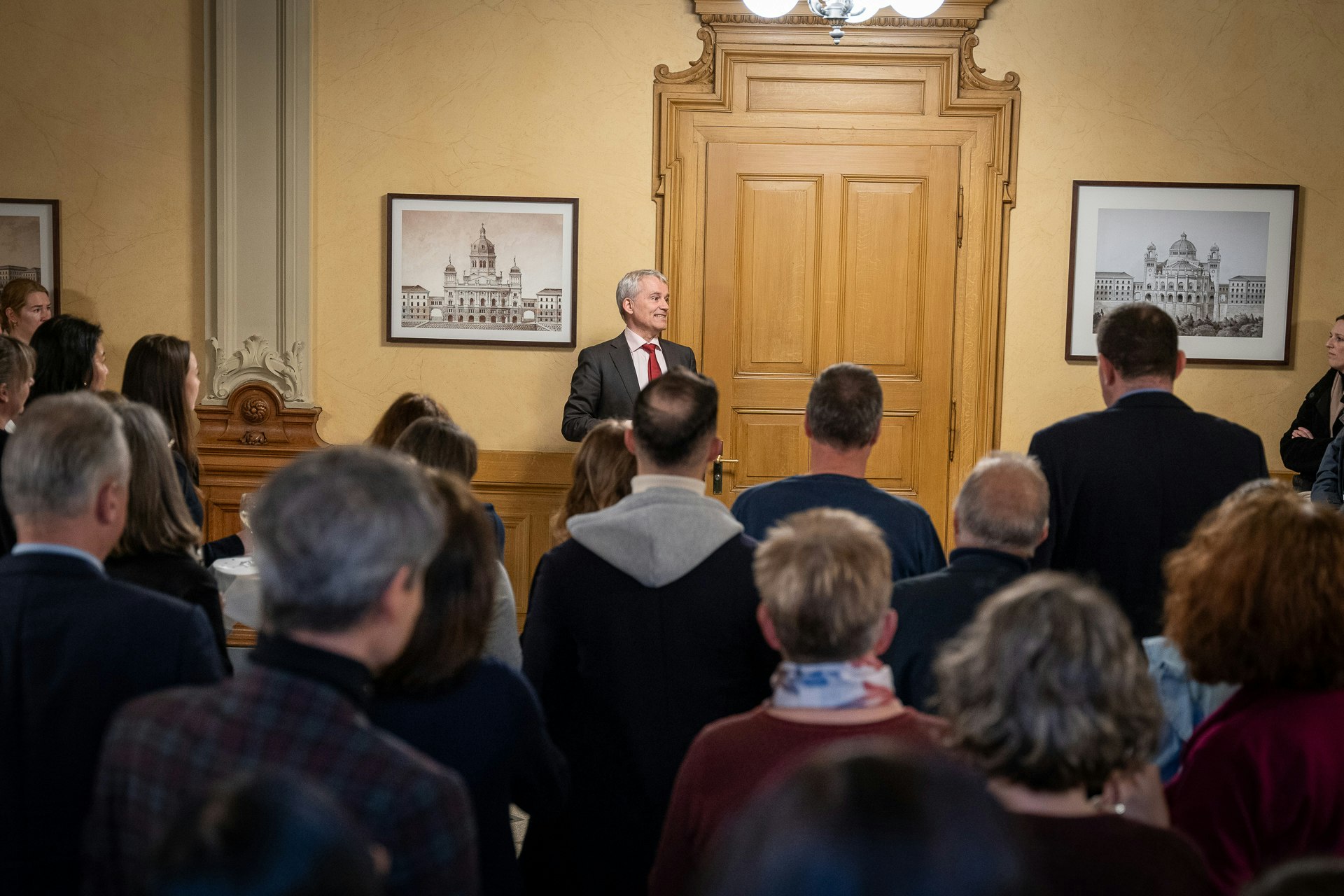 Hoch die Gläser auf ein erfolgreiches 2025: Über hundert Mitarbeitende des GS haben beim Neujahrsapéro anfangs Januar die Gelegenheit genutzt, bei Wurst, Brot und Kartoffelsalat auf das neue Jahr anzustossen und der Führung des GS die Unterstützung zuzusichern. Bundesrat Beat Jans dankte allen für das grosse Engagement im vergangenen wie auch im laufenden Jahr.