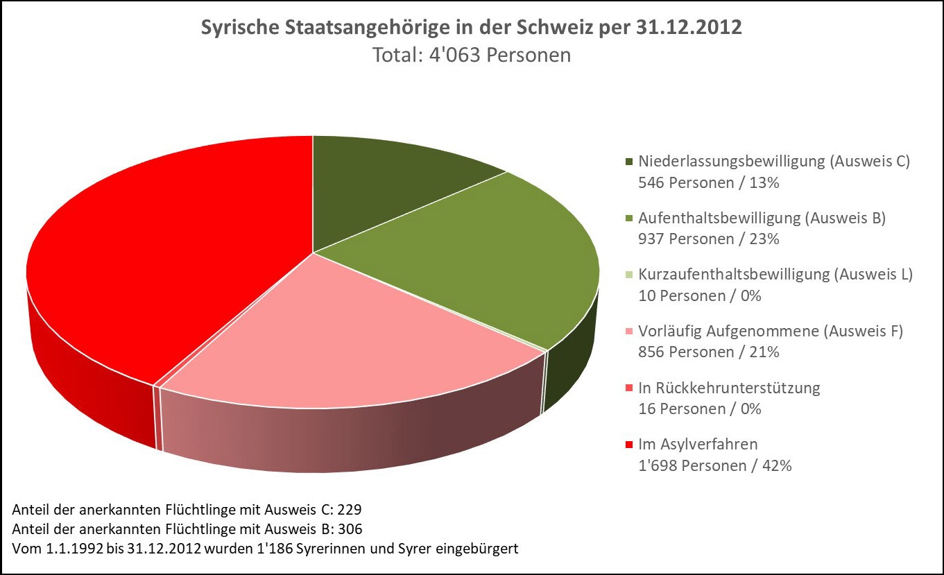 - Bei den Visaerleichterungen für Syrerinnen und Syrer konnten 2013 rund 2700 Personen (Eingebürgerte sowie Personen mit einer Aufenthalts- oder Niederlassungsbewilligung nicht aber vorläufig Aufgenommene) in der Schweiz Visaerleichterungen für ihre Familienangehörigen in Anspruch nehmen. In der Folge wurden 5000 Einreisen naher und entfernter Verwandte in die Schweiz bewilligt.