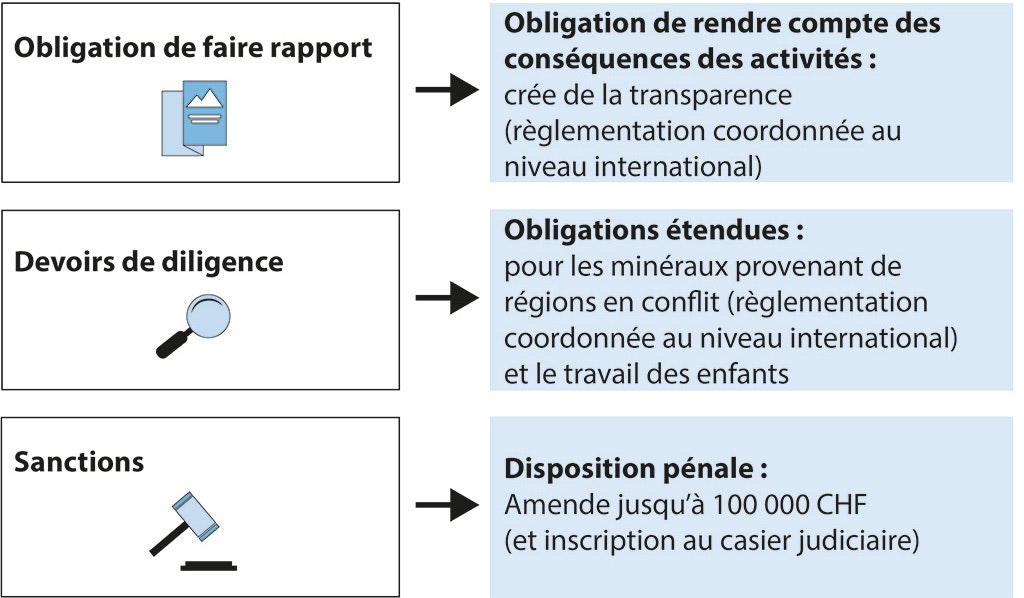 Le travail des enfants et l’origine des minéraux sont des sujets particulièrement sensibles. C’est pourquoi le contre-projet veut que les entreprises soient spécialement attentives à ces aspects. Les obligations de diligence prévues imposent aux entreprises de connaître par exemple les conditions de travail pratiquées par un fournisseur. Certains minéraux peuvent provenir de régions en conflit. Le négoce de ces matières peut donc contribuer à financer des guerres. Les entreprises devront également prendre des mesures en cas de suspicion de travail des enfants. Ces obligations de diligence visent à garantir que les entreprises écartent par exemple les fournisseurs qui ne respectent pas les règles. Les entreprises devront aussi établir, sous peine de sanctions, un rapport annuel rendant compte de la manière dont elles s’acquittent de ces obligations.
