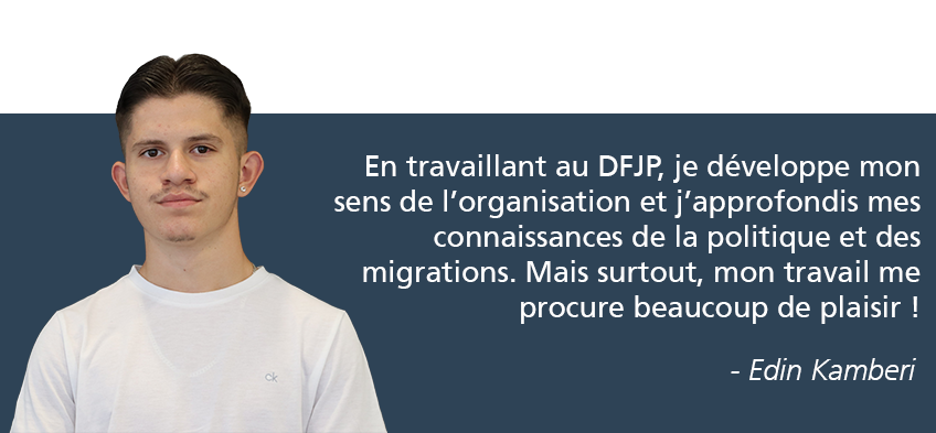 Une formation passionnante et variée. Le DFJP s’occupe de thèmes politiques et sociaux variés, comme la cohésion sociale entre les populations suisses et étrangères, le droit d’asile, la sécurité intérieure ou la lutte contre la criminalité. L’état civil et les questions ayant trait à la nationalité relèvent aussi de la compétence du DFJP, tout comme la surveillance des jeux d’argent. Une formation professionnelle au DFJP, c’est l’assurance d’entrer de manière optimale dans le monde du travail pour des jeunes engagés et motivés.