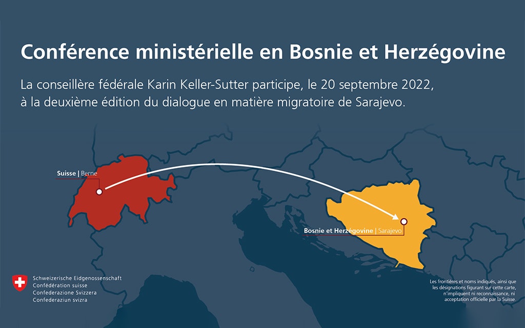 La conseillère fédérale Karin Keller-Sutter participe le 20 septembre 2022 à la deuxième édition du dialogue en matière migratoire de Sarajevo, organisé dans la capitale de la Bosnie et Herzégovine. Consacrée à la hausse des migrations secondaires irrégulières, cette conférence ministérielle doit permettre de renforcer la coopération et d’apporter un soutien aux pays touchés.