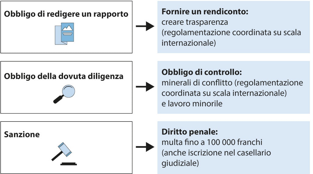 La grande maggioranza delle imprese svizzere si comporta in modo responsabile anche all’estero e fornisce un contributo importante al progresso economico, pure dei Paesi in via di sviluppo. Ciononostante anche il controprogetto intende migliorare ulteriormente la protezione delle persone e dell’ambiente, rinunciando tuttavia agli elementi dannosi dell’iniziativa ed evitando una soluzione isolata della Svizzera. Il controprogetto si fonda sulle regole in materia di responsabilità già in vigore, secondo cui ogni impresa risponde dei danni causati, in linea di massima secondo il diritto del luogo in cui si sono verificati, nonché su nuovi obblighi di trasparenza e di verifica della dovuta diligenza. Per le imprese che non rispettano tali obblighi, il controprogetto prevede una multa.